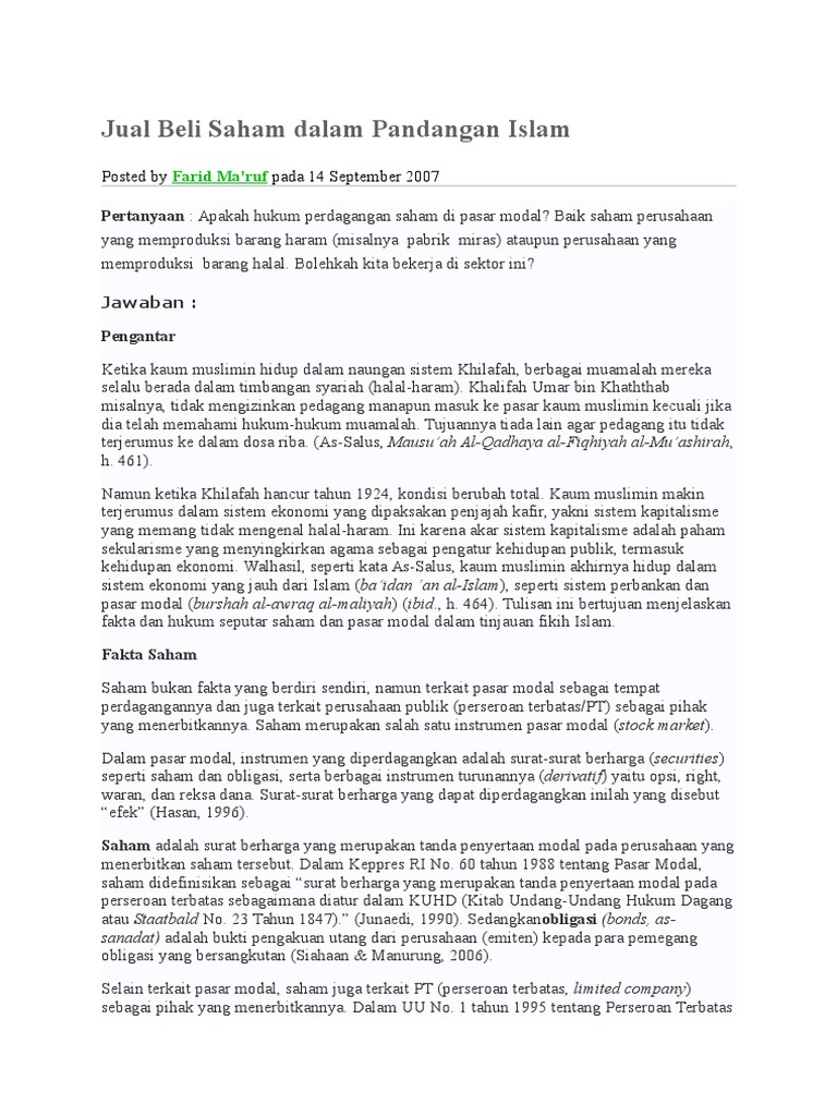 Jual Beli Saham Dalam Pandangan Islam Tsaqofah